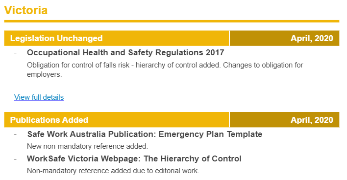 - Sourced from Commonwealth, State and Territory WHS/OHS legislation, the summaries have accurate and current detail to safety compliance.